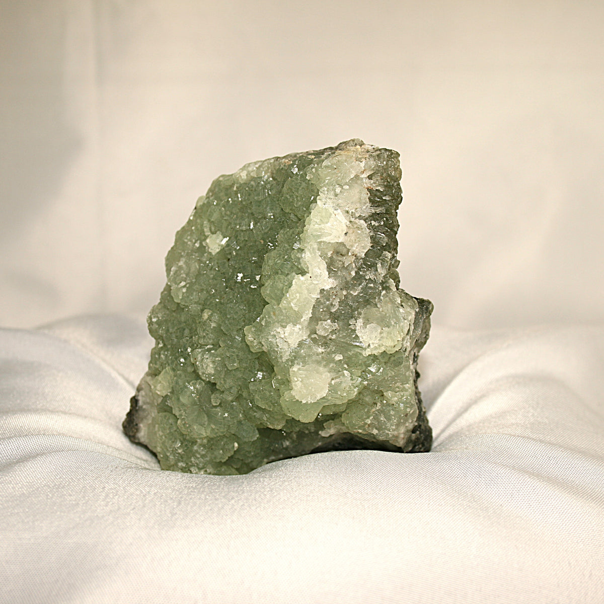 Prehnite has been used for centuries by shamans in Southern Africa for its ability to connect the physical and non-physical worlds, and thus its divination abilities. Epidote is a stone that increases whatever it touches. Prehnite boosts prophetic abilities, enhances visualization, lucid dreaming, and spiritual knowledge. It aids in connecting us to higher realms, including our higher selves, as well as spiritual, and extraterrestrial beings. The addition of Epidote to the Prehnite further increases perception and interaction with spiritual beings. This makes Prehnite with Epidote an excellent stone to use when working with tarot or crystal balls. Prehnite fosters a strong sense of trust in Universal Principles, and our own ability to magnetize what we need. As such, Prehnite helps us stop hoarding and focusing on material possessions. Prehnite clears toxins from the body and balances the meridians, helps us recognize our own boundaries, and say no to unreasonable requests. Prehnite with Epidote can be used to revitalize our personal healing environment, and when working with energy grids to enhance protective fields, calm, and bring inner peace. On a physical level, Prehnite is wonderful for those with kidney or bladder issues, as it helps stabilize the organs to release toxins. Epidote's ability to increase energy is useful in strengthening the physical body. Epidote stimulates the immune system, aids in healing, and is a great stone to use for physical recovery. Epidote increases personal power, clears the emotional body aura, and increases our powers of memory.